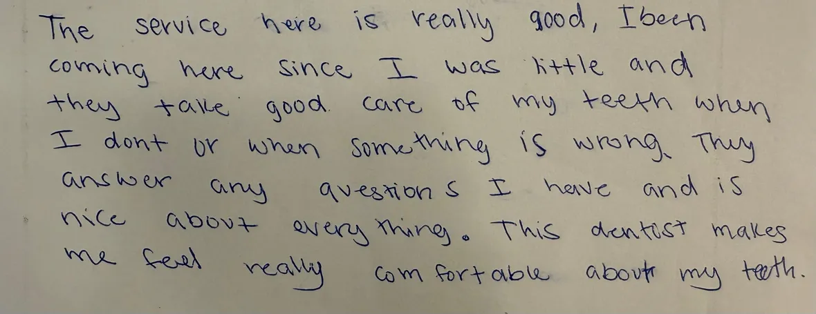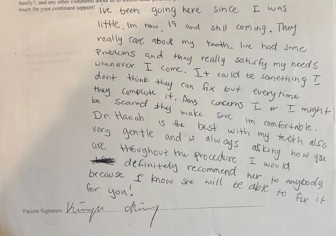 "I've been going here since I was little, I'm now 19 and still coming. They really care about my teeth. I've had some problems and they really satisfy my needs whenever I come. It could be something I don't think they can fix, but every time they complete it. Any concerns I or I might be scared of, they make sure I'm comfortable. Dr. Hanah is the best with my teeth also very gentle and is always asking how you are throughout the procedure. I would definitely recommend her to anybody because I know she will be able to fix it for you!"