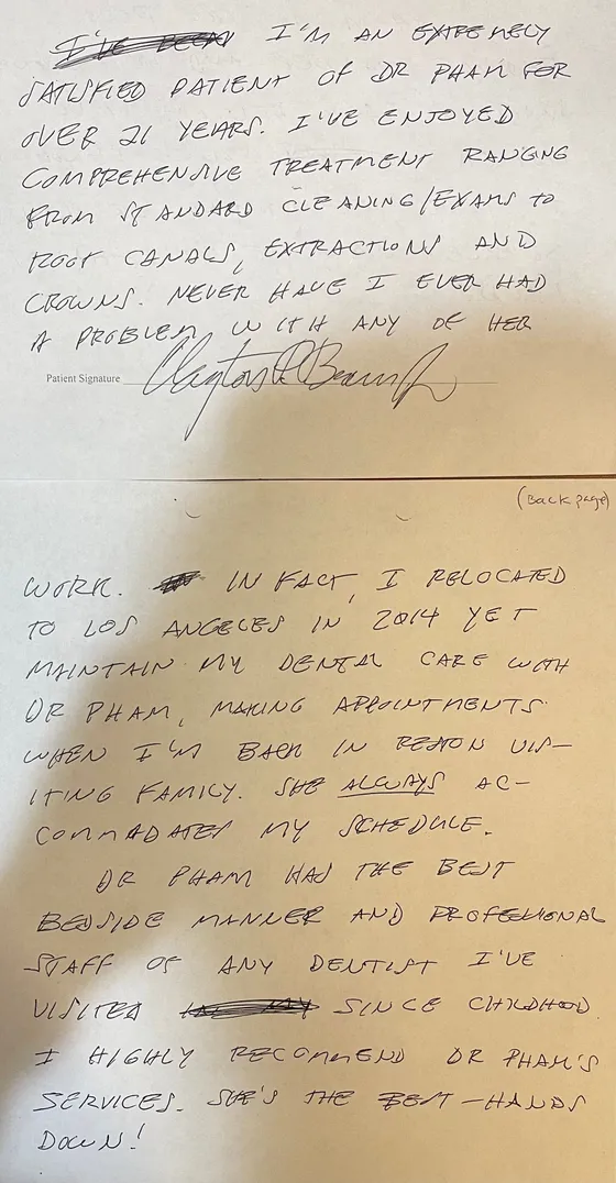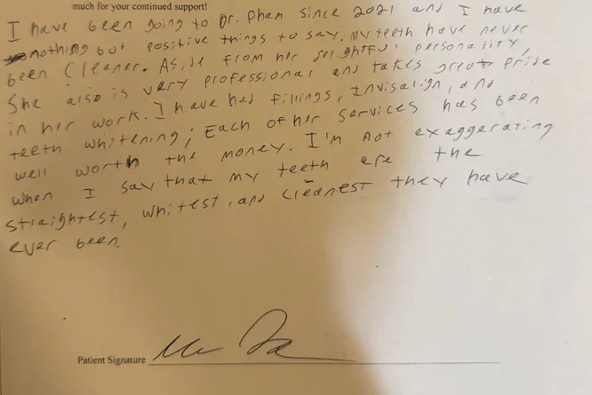 "I have been going to Dr. Pham since 2021 and I have nothing but positive things to say. My teeth have never been cleaner. Aside from her delightful personality, she is also very professional and takes great pride in her work. I have had fillings, invisalign, and teeth whitening. Each of her services have been well worth the money. I'm not exaggerating when I say my teeth are the straightest, whitest, and cleanest they have ever been."