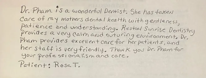 "Dr. Pham is a wonderful dentist. She has taken care of my mother's dental health with gentleness, patience, and understanding. Reston Sunrise Dentistry provides a very calm and nurturing environment. Dr. Pham provides excellent care for her patients and her staff is very friendly. Thank you Dr. Pham for your professionalism and care."