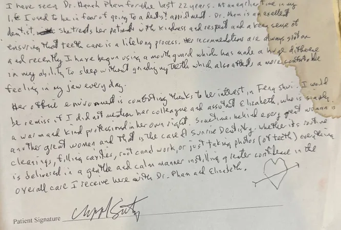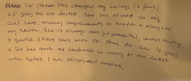 "Dr. Pham has changed my feelings (+ fears) of going to the dentist. She has advised on my oral care, making improvements to benefit + elongate my health. She is always non-judgemental, understanding, and gentle. I have been with Dr. Pham for over 10 years and she has made me feel comfortable in coming to the dentist when before I was nervous and anxious."