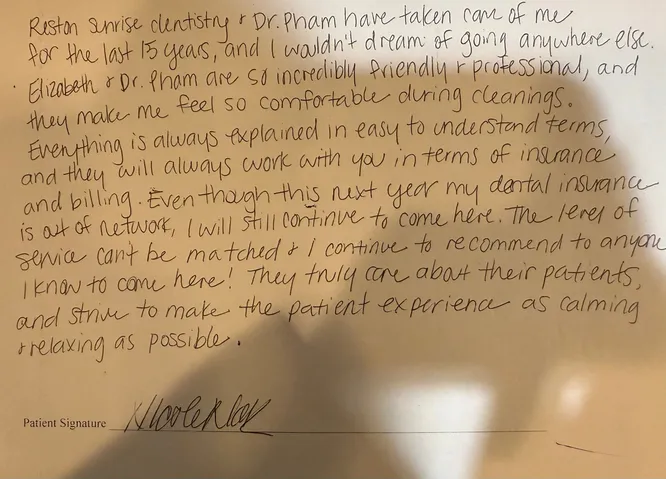 "Reston Sunrise Dentistry and Dr. Pham have taken care of me for the last 15 years, and I wouldn't dream of going anywhere else . Elizabeth + Dr. Pham are so incredibly friendly and professional, and they make me feel so comfortable during cleanings. Everything is always explained in easy to understand terms and they will always work with you in terms of insurance and billing. Even through this next year my dental insurance is out of network, I will still continue to come here. The level of service can't be matched and I continue to recommend to anyone I know to come here! They truly care about their patients, and strive to make the patient experience as calming and relaxing as possible."