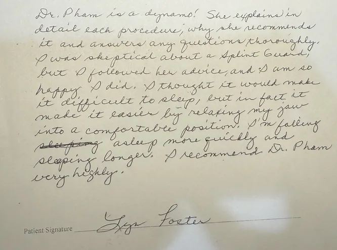 "Dr. Pham is a dynamo! She explained in detail each procedure; why she recommends it and answers any questions thoroughly. I was skeptical about a splint guard but I followed her advice, and I am so happy I did. I thought it would make it difficult to sleep, but in fact, it made it easier by relaxing my jaw into a comfortable position. I'm falling asleep more quickly and sleeping longer. I recommend Dr. Pham very highly."