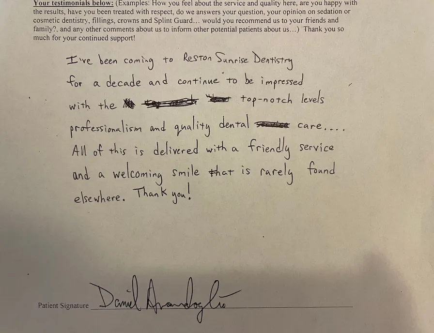 Patient: Daniel A. "I've been going to Reston Sunrise Dentistry for a decade and continue to be impressed with the top-notch levels of professionalism and quality dental care. All of this is delivered with a friendly service and a welcoming smile that is rarely found elsewhere. Thank you!"